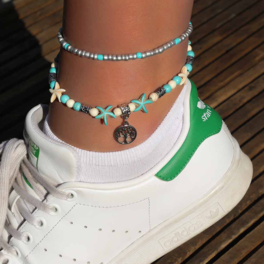 De zomer is in aantocht en dus ook die heerlijke stranddagen. Hoe leuk is het om er tip top uit te zien als je heerlijk in de zon ligt, daar bij die hippe loungetent of gewoon lekker op je handdoekje in het warme zand. Met dit dubbellaags kralen enkelbandje met levensboom bedel zie je er zo sexy uit op het strand. De bovenste laag van dit dubbellaags kralen enkelbandje met levensboom bedel bestaat voornamelijk uit zilverkleurige kraaltjes afgewisseld met hier en daar een turquoise kraaltje. De onderste laag bestaat uit witte en turquoise kraaltjes afgewisseld met metalen schakeltjes en zeesterretjes met in het midden een metalen bedeltje in de vorm van een levensboom. Dit kralen enkelbandje met levensboom bedel zorgt er voor dat je strandoutfit compleet zal zijn en je stralend over het strand zal paraderen.