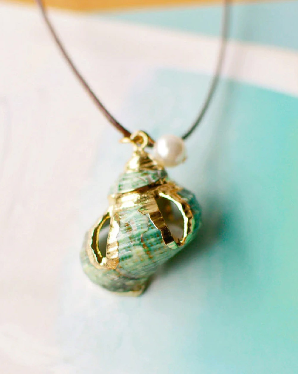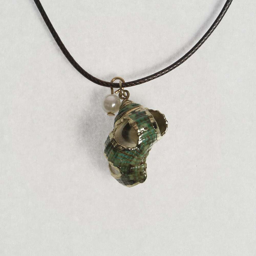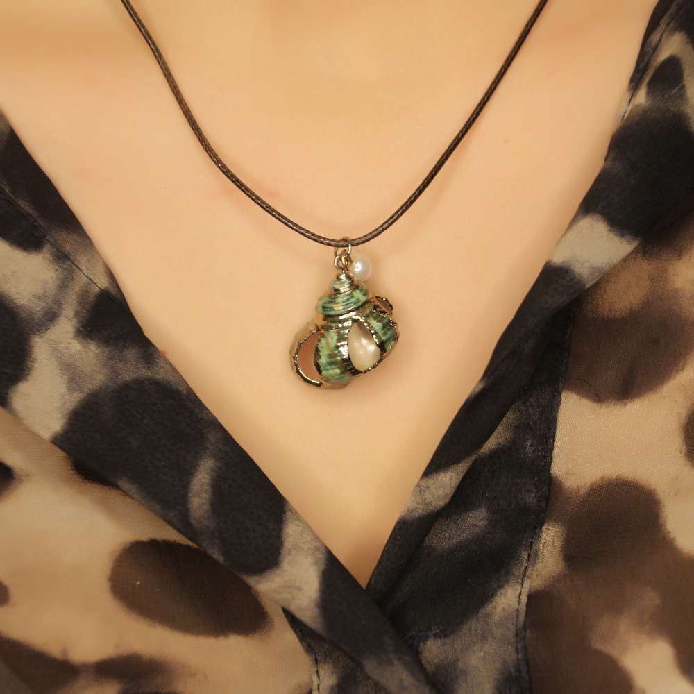De ketting is gemaakt van een bruinkleurig touw, dit geeft het een iets minder formele uitstraling mee. Maar wie houd je tegen als je deze ketting wilt dragen bij een mooie jurk? Het is immers jouw sieradenverzameling, jij bent hier geheel de baas over! Op de schelp zijn verschillende goudkleurige randjes aangebracht, door deze prachtige kleuren zal de ketting dan ook voorzien zijn van een mooie schittering in de zon.